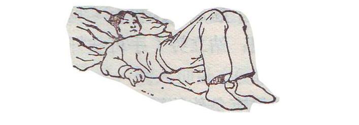 病人仰卧在高枕上,臀尾骨部垫一个枕头,双腿屈在胸前,双手抱住,腰部自然下沉十五分钟以上。这种姿势可以使腰椎后缘间隙增大,利用韧带的动力,把突出的骸核推入椎间盘间隙内。