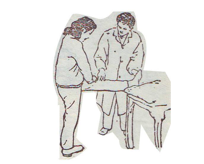 病人俯卧在平板床上,腰部挺在板床上,头、足两头向上翘起十次以上。