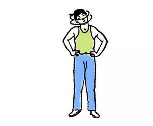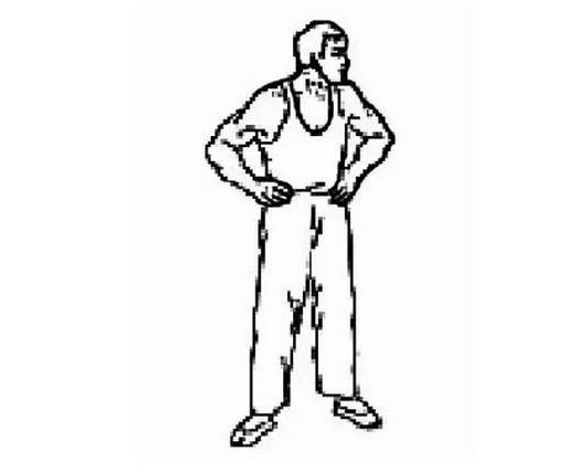 两腿分立与肩同宽,双手叉腰,头颈前伸并转向右下方,双目向前下视。左右交替,重复6~8 次。