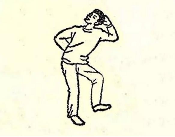 两腿分开与肩同宽,两臂自然下垂,两腿微屈,左手上举,手掌置头后,右手背置腰背后,上体前倾45° ,左右旋转,头随旋转向后上方做望月状,重复6~8 次。