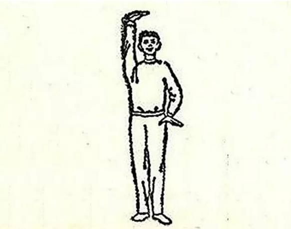 两腿并拢,两臂自然下垂,右肘屈曲,掌心向上,伸直肘,手掌向上托起;左肘微屈,左手用力下按,头同时后仰,向上看天。左右交替,重复6~8 次。