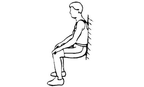 (2)靠墙静蹲:背靠墙壁,双足前伸分开,与肩等宽,使大腿与小腿成接近 90 度(略小于 90 度)的夹角,坚持 20 秒,缓慢放松,每组 20 次,每天 10 组。